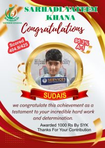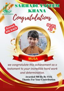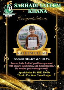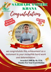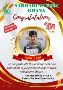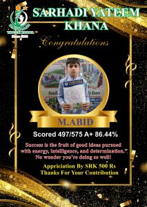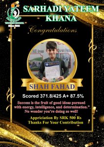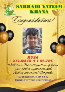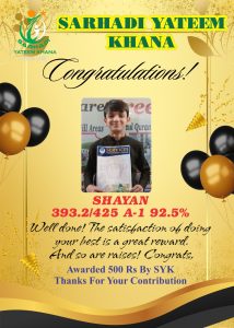 Every year we give Position holders Cash Prizes. This year we gave 1000Rs Cash Prize to Position holders. 500Rs who Achieved 90% Marks and 80% Marks. This year like every year Sarhadi Yateem Khana (SYK) orphan students took positions in their respective classes. Following are the results of STAR PERFORMERS OF SYK.